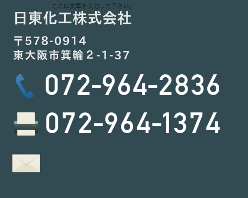 所在地;東大阪市箕輪2-1-37 TEL;072-964-2836 FAX;072-964-1374 e-mail;kk@nittokako.com E メール